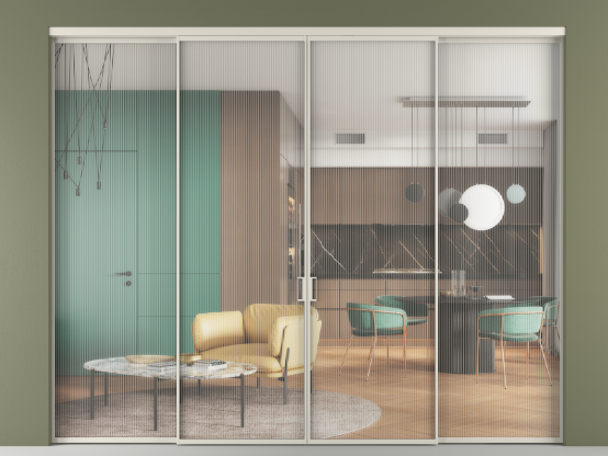 Дополнительно на раздвижную двустворчатую перегородку вдоль стены и четырёхстворчатую перегородку внутри проёма с двумя неподвижным полотнами можно установить механизм синхронного открывания — при открывании одной створки, вторая открывается автоматически.